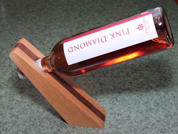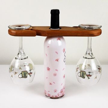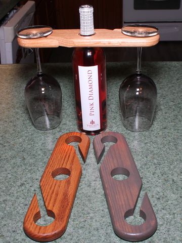This piece will fit over the neck of your wine bottle and hold two empty wine glasses.
