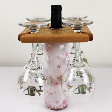 This piece will fit over the neck of your wine bottle and hold four empty wine glasses.